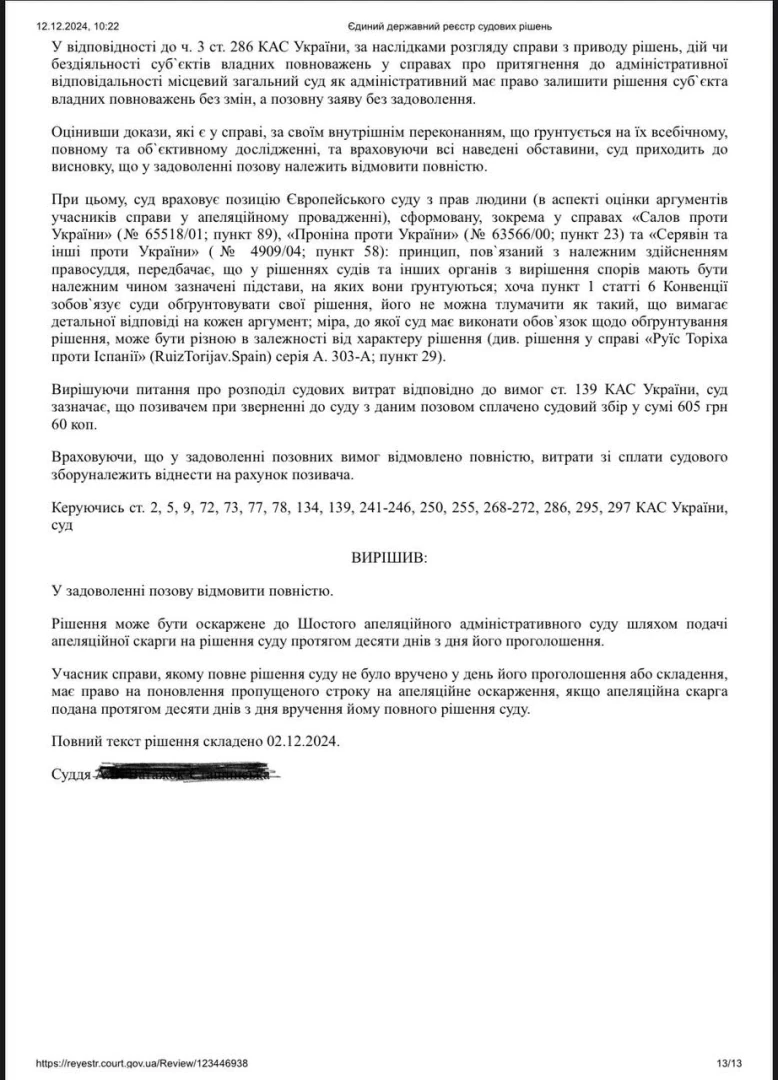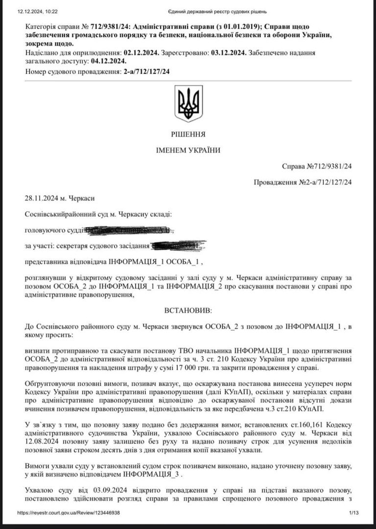 Истец был привлечен к административной ответственности за нарушение правил воинского учета. Суть обвинения — непредъявление воинского документа 26 июля 2024 года. Сумма штрафа составила 17 000 гривен. Гражданин обратился к юристке Алине Рачковской с просьбой обжаловать постановление о правонарушении.